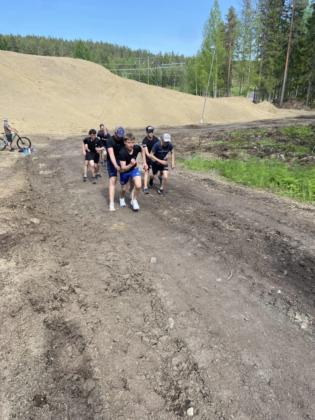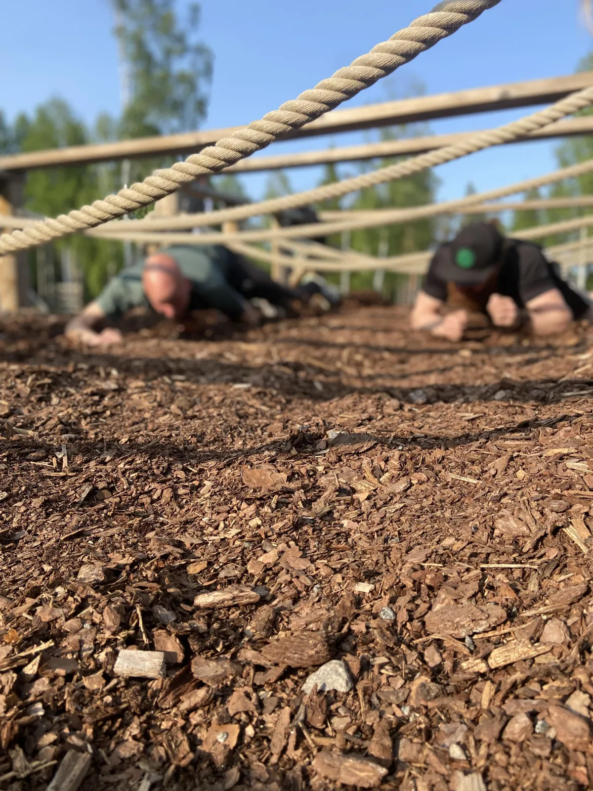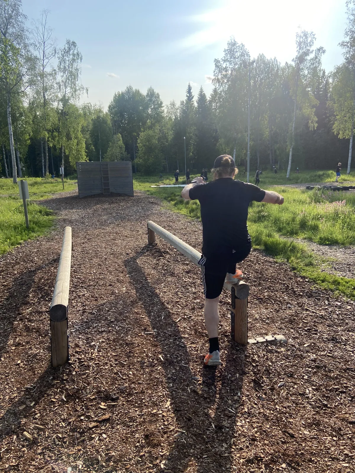 Använd bekväma träningskläder och stabila skor som funkar för utomhusaktiviteter. Ett par tunna handskar kan också vara skönt för grepp vid vissa hinder. Vattenflaska!